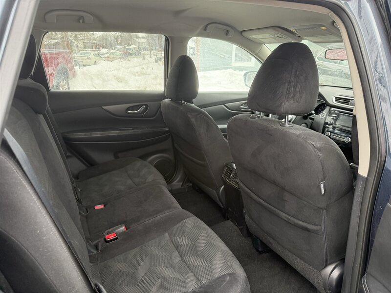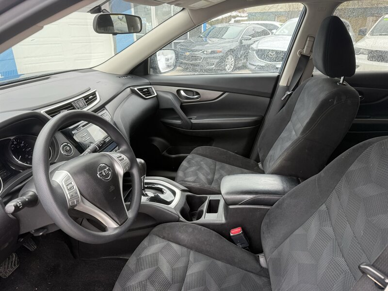 2014 Nissan Rogue SV in Blue with Black cloth interior. Powered by a 2.5L I4 producing 170 hp and 175 lb-ft, paired with Nissan’s Xtronic CVT; EPA-rated at 25 MPG city and 32 MPG highway. Factory-equipped features include 17-inch alloy wheels and roof rails, full power accessories (power windows, door locks and mirrors) and remote keyless entry. Comfort and convenience features include cruise control, a tilt/telescoping steering column, steering-wheel audio and Bluetooth hands-free controls, plus an AM/FM/CD audio system with auxiliary and USB inputs. Interior practicality is provided by cloth seating, a 60/40 split-folding rear seat for expanded cargo space and multiple storage bins. Standard safety equipment includes anti-lock brakes, electronic stability and traction control, multiple airbags and LATCH child-seat anchors. This vehicle is in excellent overall condition.