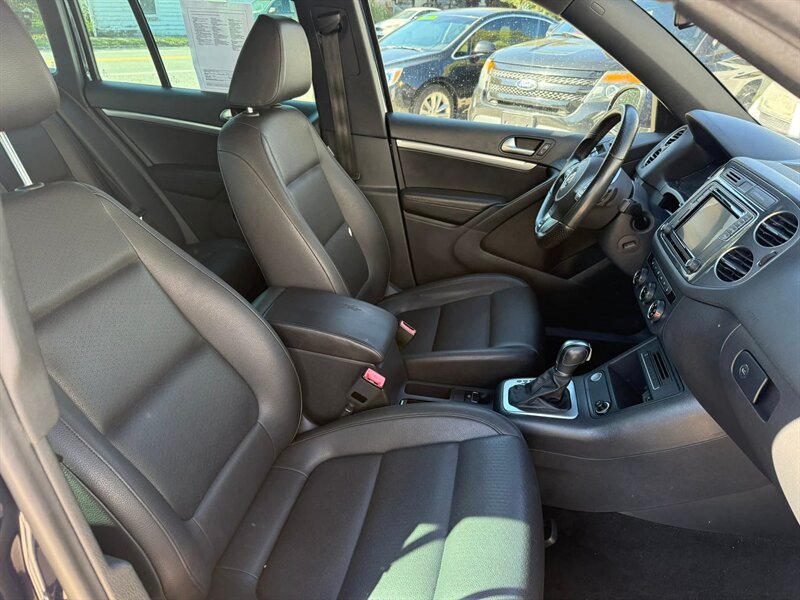 Introducing the 2016 Volkswagen Tiguan 2.0T S, a compact SUV that combines practicality with performance. Powered by a robust 2.0L Turbo I4 engine, it delivers 200 horsepower and 207 ft-lbs of torque, ensuring a responsive driving experience. With a striking Blue exterior and a sleek Black interior, this vehicle boasts an appealing aesthetic.